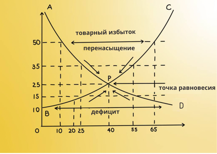 Если продавцы предлагают больше товаров, чем потребители хотят купить, возникает товарный излишек. Это заставляет продавцов снизить цену, чтобы избавиться от излишка. Продавцы с самыми высокими издержками производства понесут убытки и, скорее всего, уйдут с рынка данного товара. Цена будет падать до тех пор, пока не достигнет уровня, при котором количество товара, которое потребители готовы купить, будет равно количеству, которое продавцы готовы предложить. Эта цена называется равновесной. Если цена ниже равновесной, потребители захотят купить больше, чем продавцы будут готовы предложить. Это приведет к дефициту, в ответ на который рыночные силы подтолкнут цену вверх. Таким образом, происходит постоянная невидимая и непреднамеренная координация поведения покупателей и продавцов, результатом которой является цена, уравновешивающая спрос и предложение.