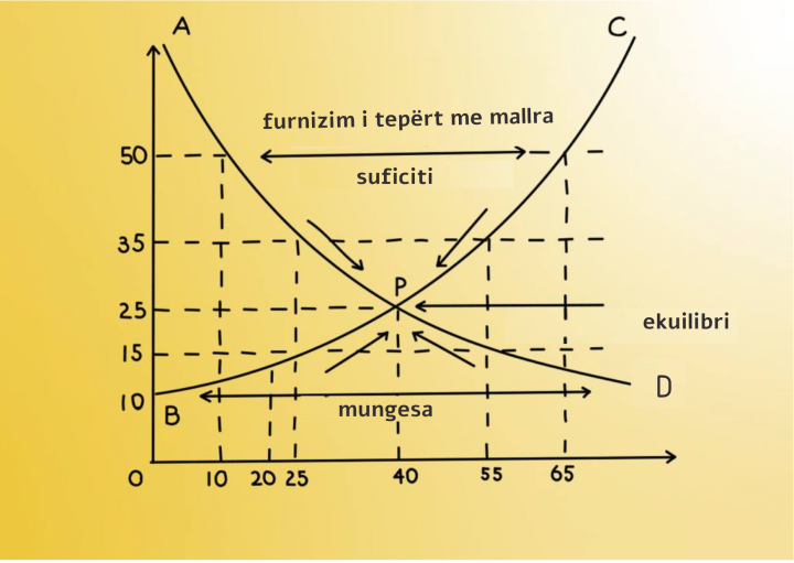 Nëse shitësit ofrojnë më shumë mallra sesa duan të blejnë konsumatorët, atëherë do të ketë suficit të një malli.Kjo do t'i detyrojë shitësit të ulin çmimin në mënyrë që të çlirohen nga suficiti. Shitësit që prodhojnë me kosto më të larta do të pësojnë humbje dhe ekziston mundësia që të largohen nga tregu për shkak të këtij produkti të veçantë. Çmimi do të bjerë deri në nivelin ku sasia e mallrave që konsumatorët janë të gatshëm të blejnë të jetë e barabartë me sasinë që shitësit janë të gatshëm të ofrojnë. Ky çmim quhet "çmimi i ekuilibrit". Nëse çmimi është nën ekuilibrin, konsumatorët do të duan të blejnë më shumë, sesa janë të gatshëm të ofrojnë shitësit. Kjo do të sjellë mungesë, në përgjigje të së cilës forcat e tregut do të shkaktojnë rritjen e çmimeve. Kështu, ekziston një koordinim i vazhdueshëm i padukshëm dhe i paqëllimshëm i veprimit midis blerësve dhe shitësve, rezultati i të cilit është një çmim që kënaq shitësit dhe blerësit dhe një ekuilibër midis kërkesës dhe ofertës.