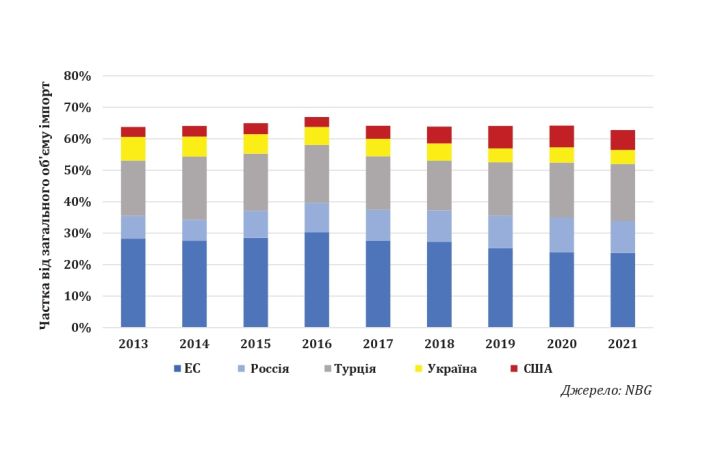 Діаграма 1. Частка імпорту Грузії з різних країн (2013–2021)