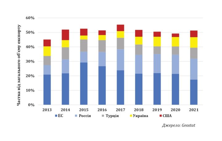 Діаграма 2. Частка експорту Грузії до різних країн (2013–2021)