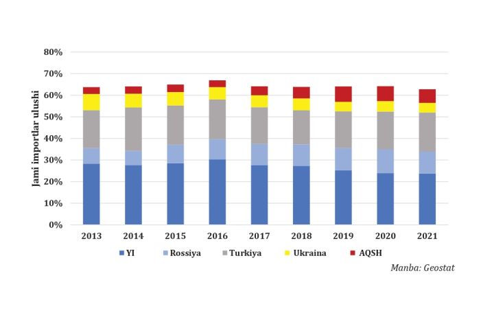 1-chizma: Gruziyaning turli mamlakatlardan keladigan import mahsulotlari ulushi (2013-2021-yillar)