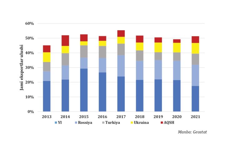 2-chizma: Gruziyaning turli mamlakatlarga qiladigan eksport mahsulotlari ulushi (2013-2021-yillar)